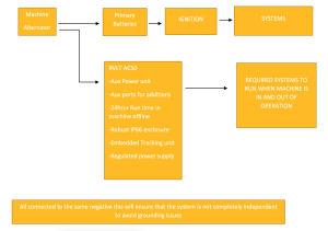 The 24/12V patented AC50 unit that powers this system will be charged using a clever algorithm.Charging units: When the machine is operating, this smart charger will deliver the necessaryenergy to essentials and charge the battery. It will then cease charging as soon as the ignition is turned off. When the machine is turned off, this charger should be able to charge the battery to a capacity that can last for more than 24+ hours, depending on the load attached (any additional additions will affect the predicted time; CCTV, PDS, and fire system are guaranteed to last for 24 hours).